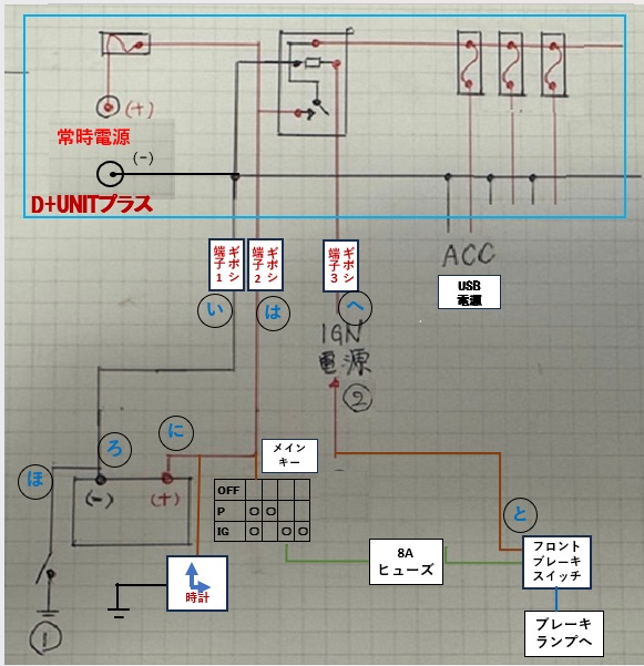 >バッテリー(マイナス)〜車体間>でカットボックスを設けて開放して >おります。リレーを使う前は、時計が動かなく>なっていたのですが >リレーを接続すると時計が動く(時間は遅れるが)ため、 >何故?となり電圧測定すると上記の結果となった次第です。 >ご回答が遅くなり申し訳ありませんが解決のヒントがございましたら幸いです。 その後何か調査の変化はありましたか?このままだと埋もれてしまいそうなので 情報を整理しませんか? 1)貴殿が書かれた回路に加筆をしましたので現状のバイクの配線とあって いるかを確認をして下さい。 2)下記の質問に回答をして下さい。 1.8月6日の添付回路と8月23の回路の電圧測定の為の2の位置が違いますがどちらが正解ですか? 2.電圧測定の2の位置は「へ-と間」のどの位置で測定をしていますか? 3.添付回路の「い-ろ間」「は-に間」はバッテリーに直接配線を接続をしていますか? 4.他に配線の加工やオプションの電気機器をつけていますか? 5.説明に「マイナス離線」とありますが回路図のどの線を指していますか? 「ほ」の線を指しているのであれば「カットスイッチ」を使わないでテストを行う理由を教えてください。 カットスイッチをオフにしていてD+UNITを付けたら「時計が動作をする」点に絞って不具合の分析をしたいですね!
